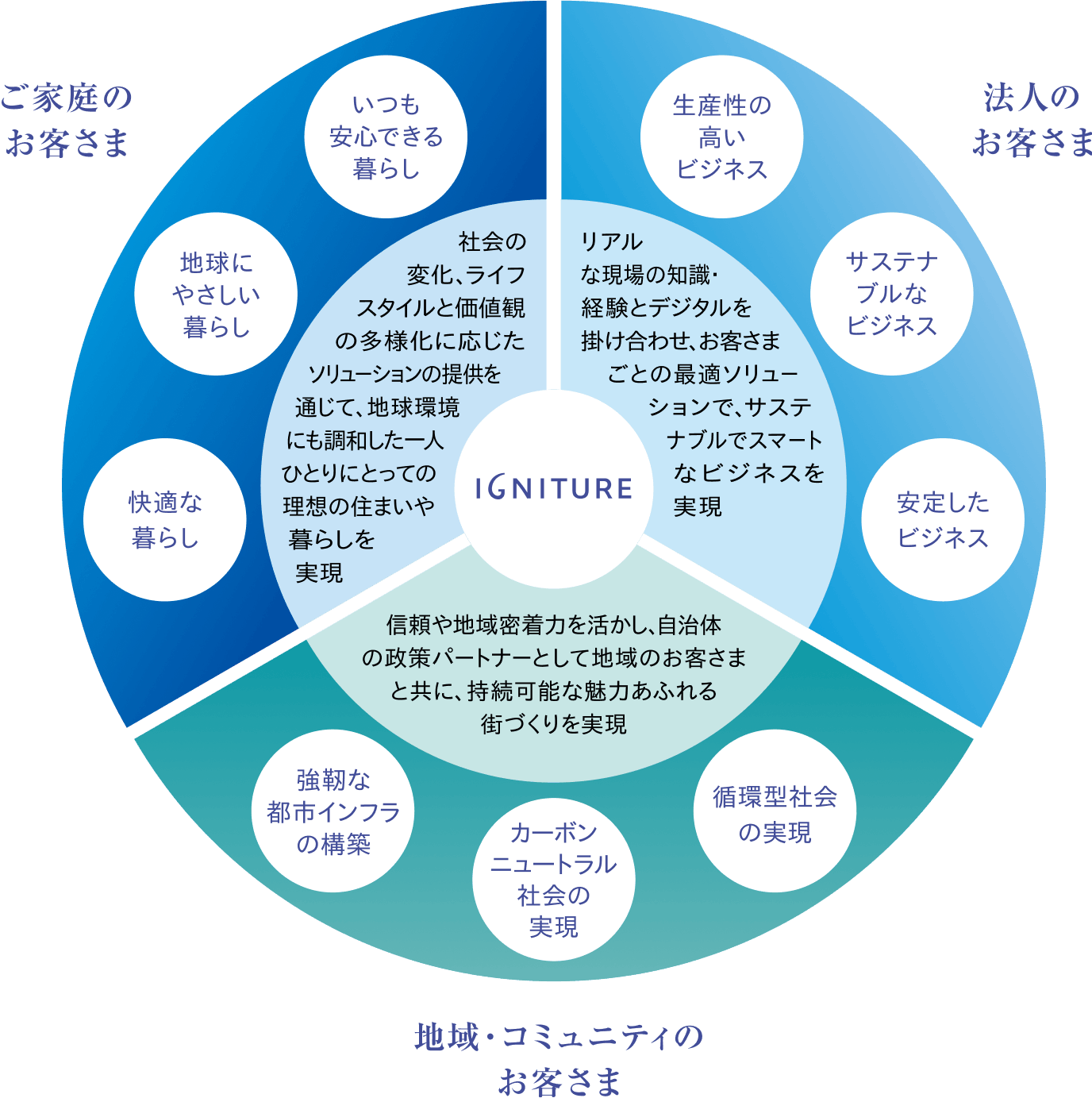 IGNITURE(イグニチャー)は、お客さまが抱える課題を解決するソリューションのブランドです。“Ignite(灯す)”と“Future(未来)”を結びつけ、エネルギー分野の枠を超え、未来に向けて先進的で多様なソリューションを提供していくという意志をブランド名称に込めています。